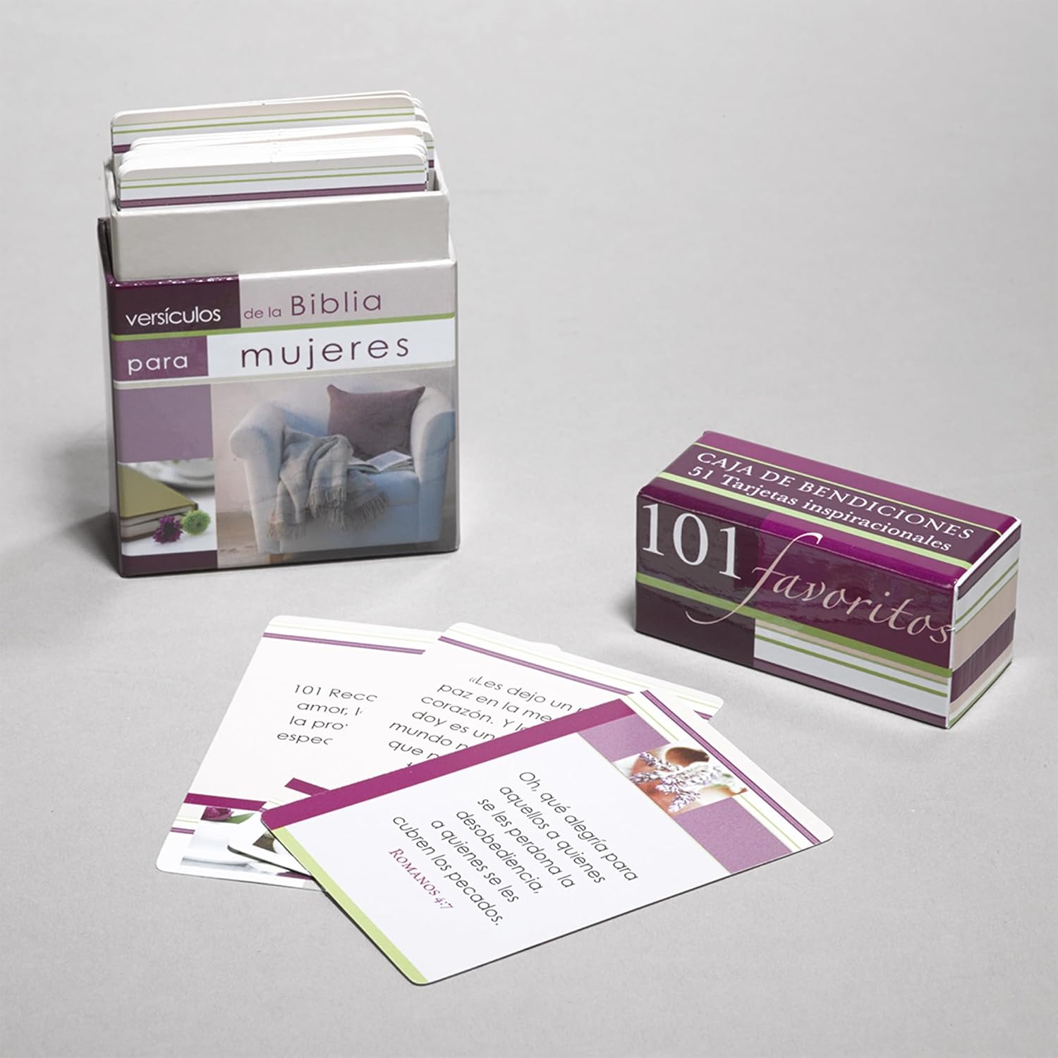 Los 101 versículos inspiradores han sido escogidos de la Palabra de Dios porque cada mujer es digna de Su amor. Cada una de las 51 tarjetas de doble cara presenta dos diseños con imágenes únicas – una en la parte frontal y otra en la parte trasera de las tarjetas y 101 versículos que te muestran cuánto Dios se preocupa por ti.