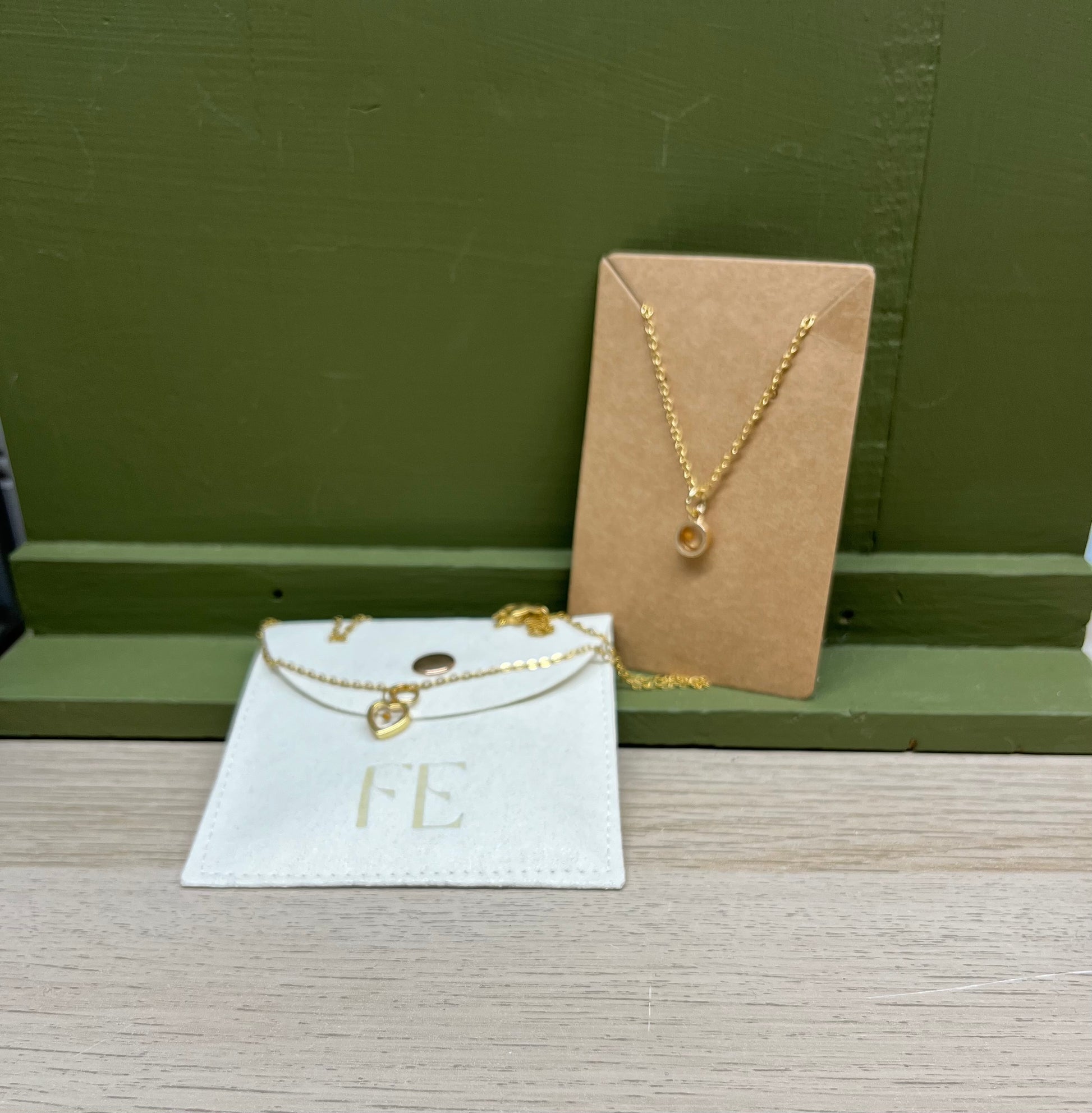 Hermosa cadena dorada con delicado dije, disponible en forma de corazón o redondo.
