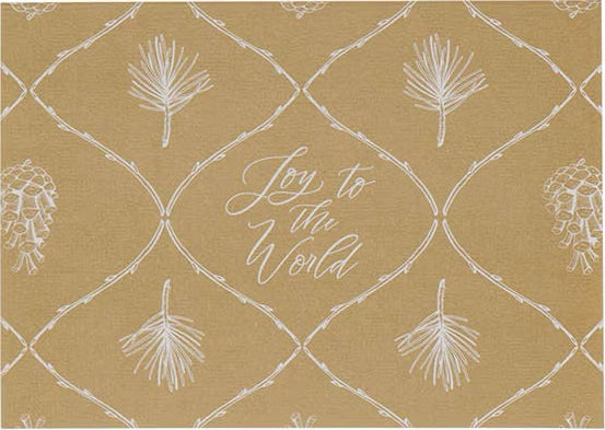 Fondo dorado con patrón geométrico de diamantes en blanco. Cada diamante incluye un pequeño motivo de rama de pino blanca, mientras que el diamante central resalta el mensaje “Joy to the World” en letras blancas. Ideal para compartir alegría y celebración con familiares y amigos.