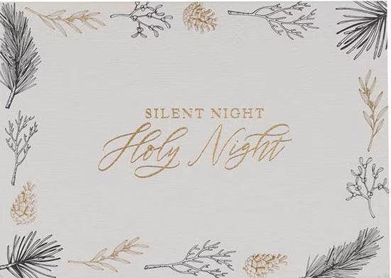 Fondo blanco elegante con un delicado borde de ramas de pino en negro y dorado. El mensaje “Silent Night / Holy Night” está impreso en letras doradas, transmitiendo serenidad y paz navideña. Perfecta para expresar cariño y buenos deseos durante la temporada festiva.