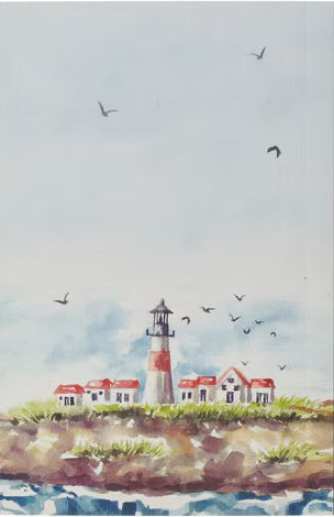 Un faro sereno contra un cielo azul con neblina adorna la portada del pequeño libro de regalo. El título se presenta en letras blancas con azul metálico ubicadas en un cuadro azul marino con borde azul cielo.