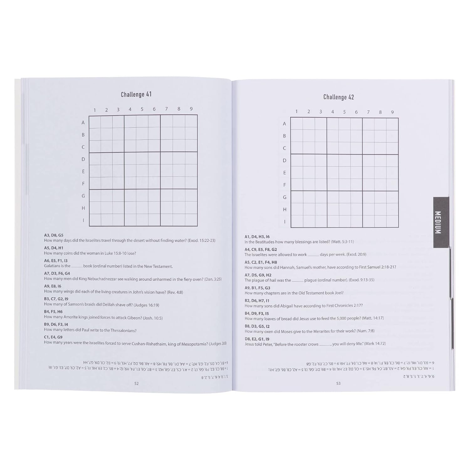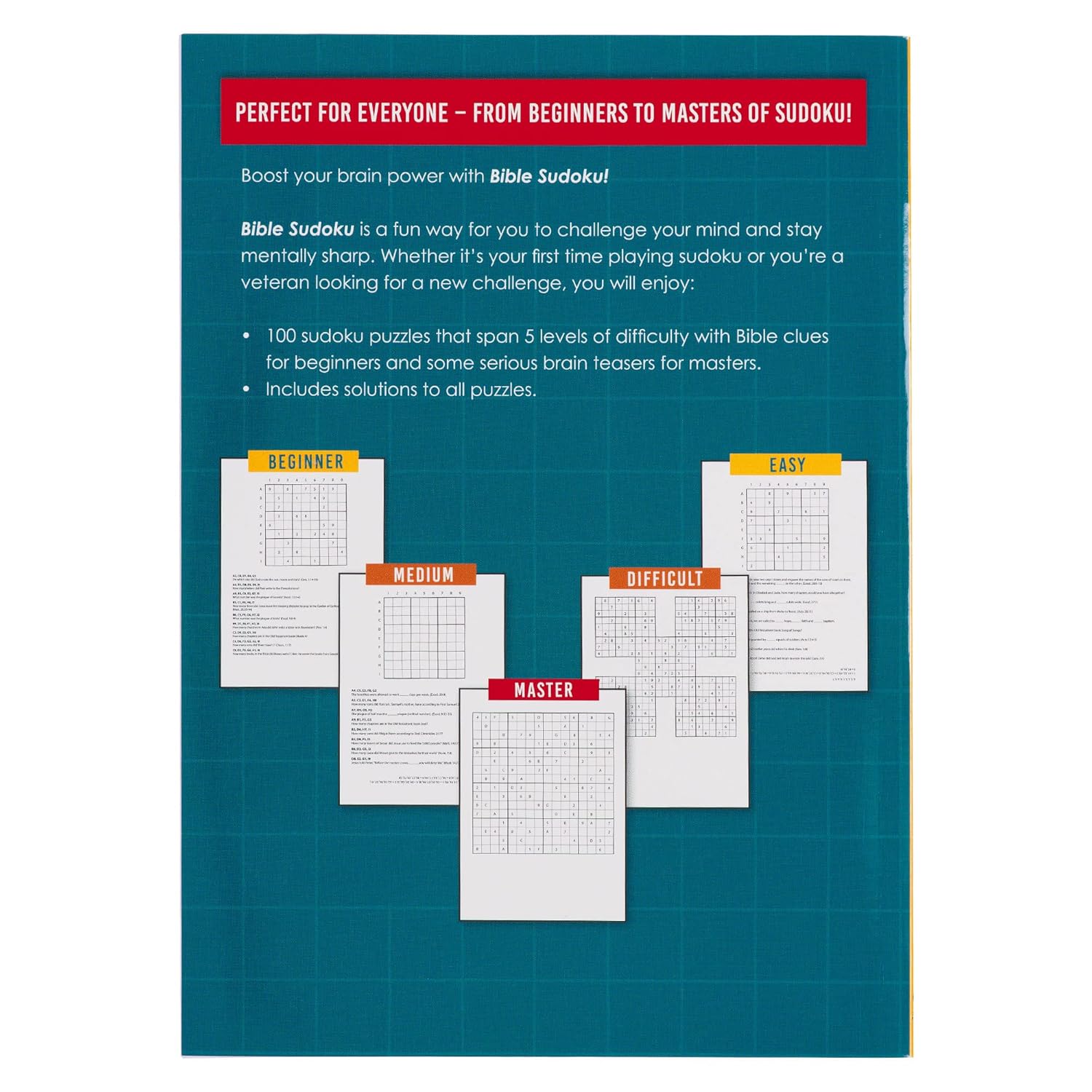 Las páginas interiores son blancas, impresas en negro, e incluyen 100 sudokus para resolver. Las pistas bíblicas hacen que los rompecabezas sean accesibles para quienes recién comienzan, mientras que los jugadores avanzados encontrarán acertijos ingeniosos que desafiarán sus habilidades. Todas las soluciones están incluidas al final del libro.